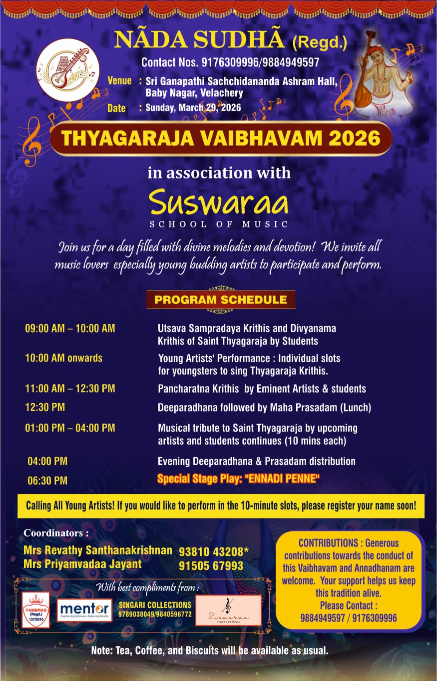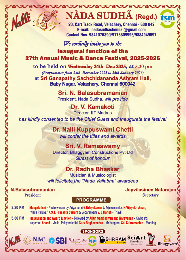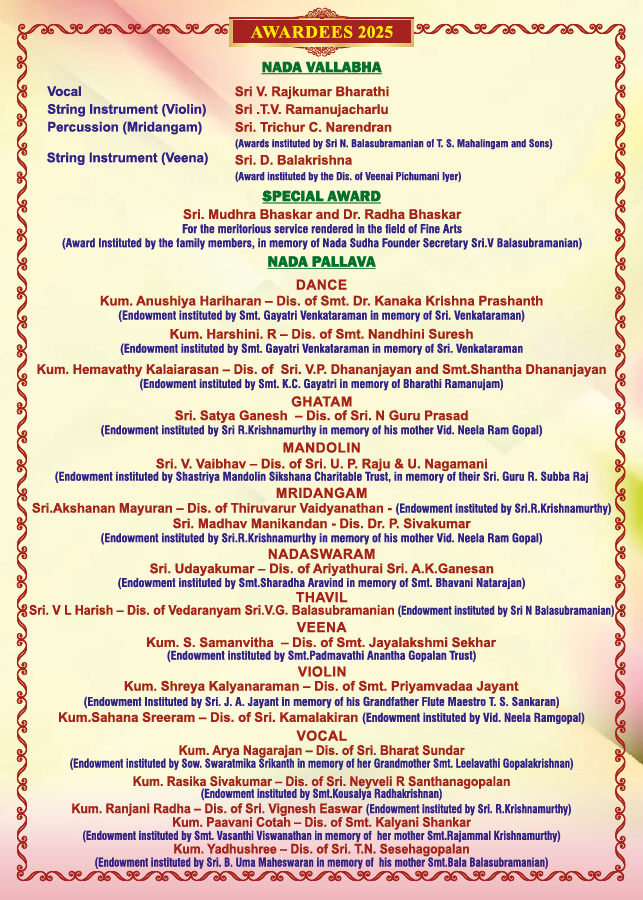 "Nada Vallabha" on Sri V Rajkumar BharAthi- Vocal Sri .T V Ramanujacharlu- Violin, Sri Trichur C Narendran- Mridangam, Sri D Balakrishna- Veena"Nada Pallava" Awards to Young talented artists on Dr RADHA BHASKAR, Musician & Musicologist will Felicitate the Awardees.